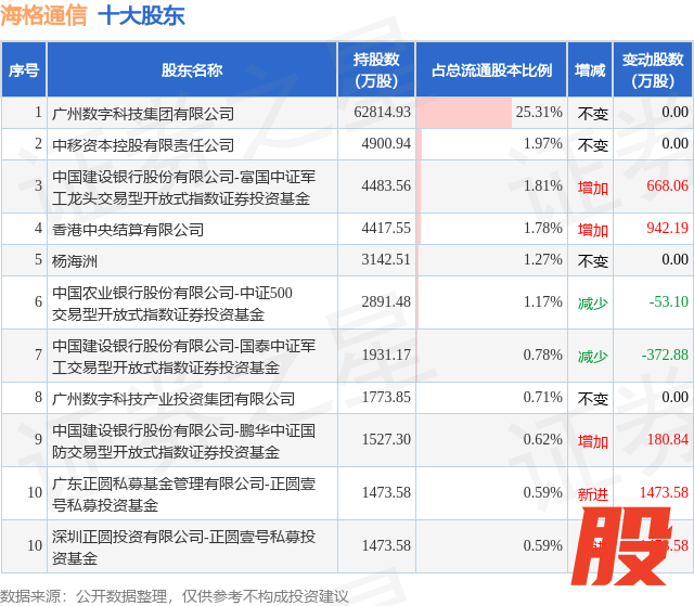 根据海格通信2025年三季报公布的十大股东详情如下: