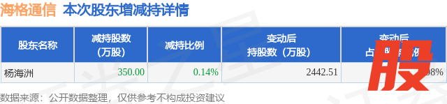证券之星消息,1月4日海格通信发布公告《海格通信:关于股东股份减持计划实施完成的公告》,其股东杨海洲于2025年12月30日至2025年12月31日间合计减持350.0万股,占公司目前总股本的0.141%,变动期间该股股价上涨2.61%,截止12月31日收盘报15.75元。