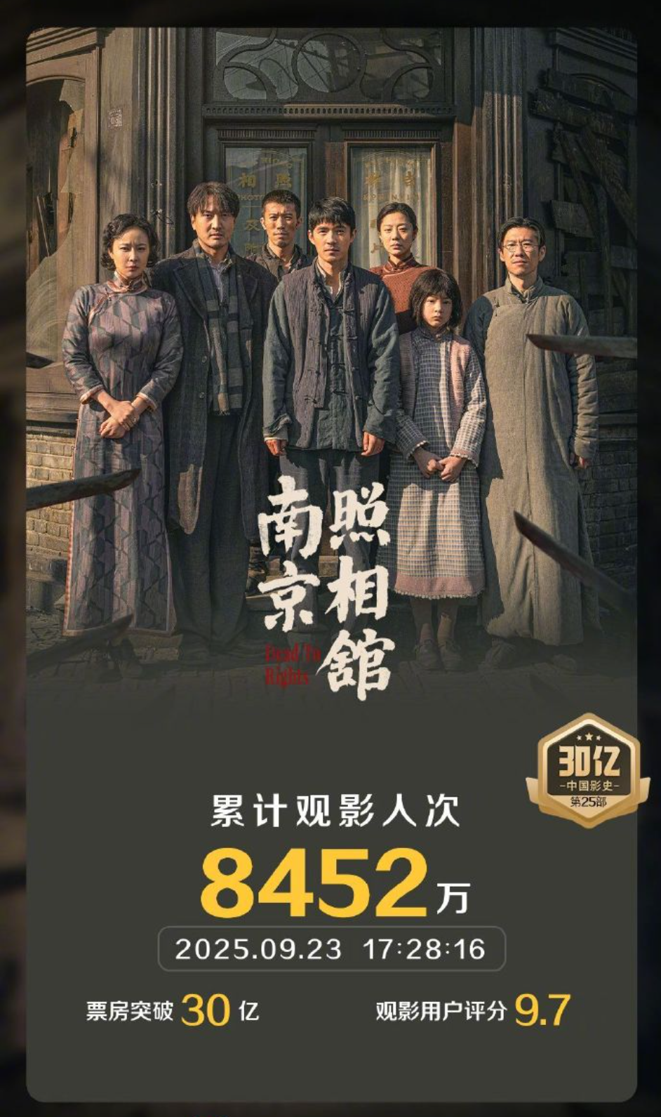 《南京照相馆》以30亿的票房成绩,暂列年度中国电影票房榜第三位,前两位为《哪吒之魔童闹海》和《唐探1900》,《731》位列第五,想超过前一名《浪浪山小妖怪》有一定难度。