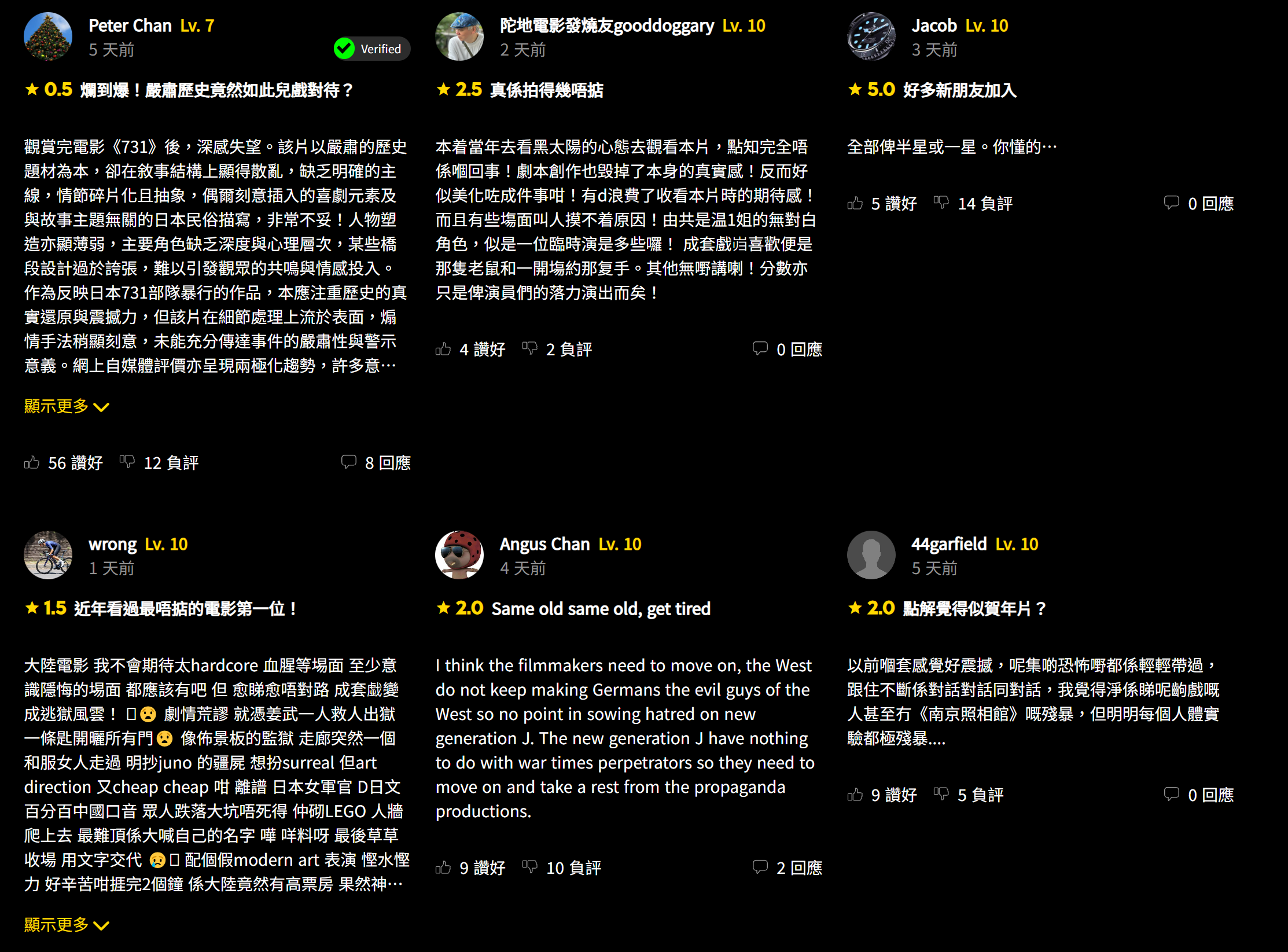 Hkmovie上,《731》的评分只有2.3。并不是香港影迷不喜欢这个题材,《南京照相馆》拿到3.8分,成龙的《捕风追影》更是高达4.4。看了下点评其实也没有情绪化的尬黑,反而是比内地观众更加理性,愿意去分析解读电影的优缺点。